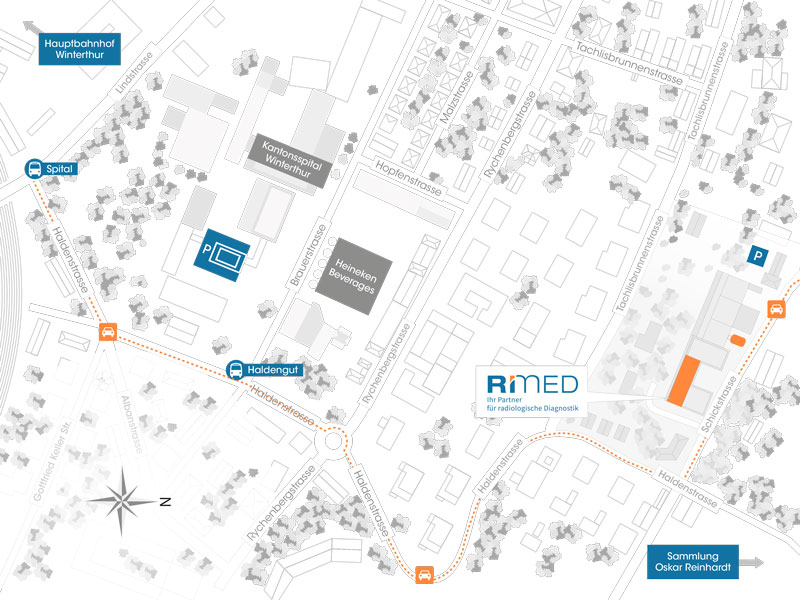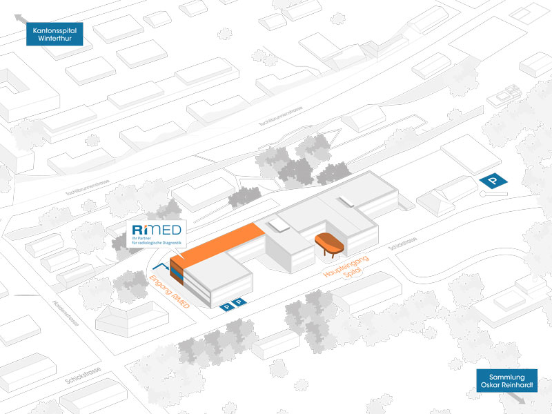 L'Istituto Radiologico Lindberg si trova nel secondo piano sotterraneo della clinica di Lindberg. Ci trovate nei pressi del bosco Eichwald tra la Collezione Oskar Reinhart "Am Römerholz" e l'Ospedale cantonale di Winterthur. I nostri moderni locali sono accessibili ai disabili e accessibili alle sedie a rotelle.